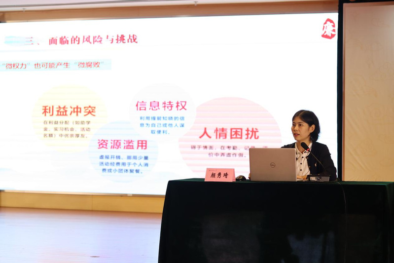 2025年9月24日,为进一步增强学生干部的廉洁自律意识,筑牢拒腐防变的思想防线,校团委邀请学校纪委办公室监督科科长颜隽琦老师,在芳华剧场为学生干部代表开展了“青春与廉洁”专题教育讲座,旨在引导学生干部树立正确的权力观、价值观,守护青春底色,担当时代使命。